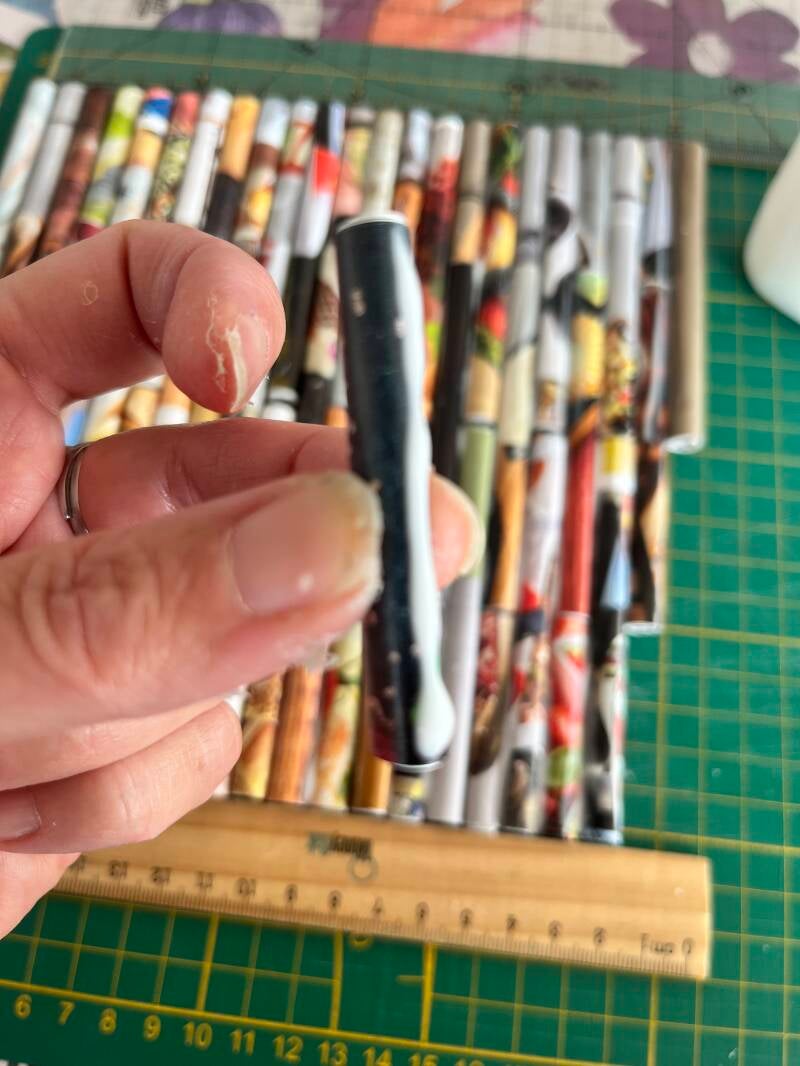 Vandaag wordt weer verder gewerkt met de rolletjes die ik aan het maken ben, maar ik ben ondertussen van gedacht veranderd: het wordt geen dienblad maar een doosje om dingen in op te bergen. De startbasis blijft wel dezelfde een plat stuk… dus tijd om de rolletjes al aan elkaar te beginnen plakken… om dat straks weer verder te gaan met wat rolletjes draaien..